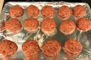 - Mix the blended ingredients into meat. Roll meat into 24 balls each about 1.5 to 2 inches in diameter. TIP: score the meat in half, then each in half again, then again to give you 8 equal portions of meat. Then roll 3 balls from each of the 8 portions to give you 24 same-size balls.