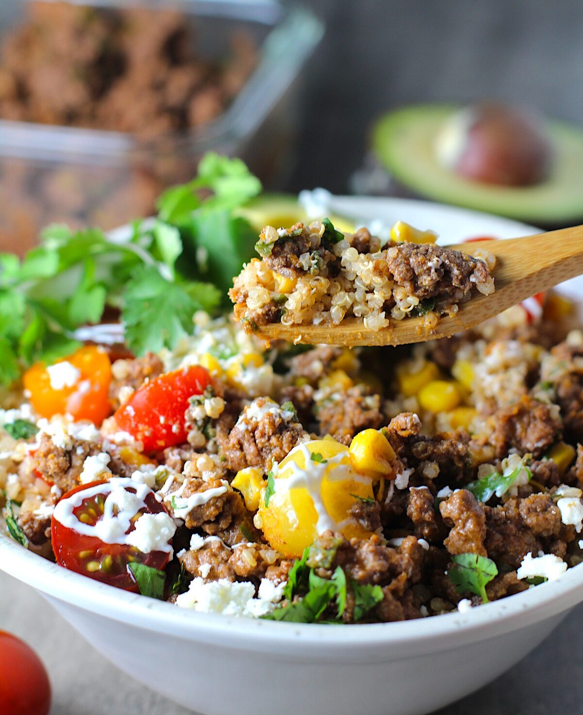 There are lots of other ideas for quinoa beef bowls, so get creative! For example, you could go with an Asian theme and cook the ground beef with ¼ cup of soy sauce. You can swap the corn with slices of red pepper.