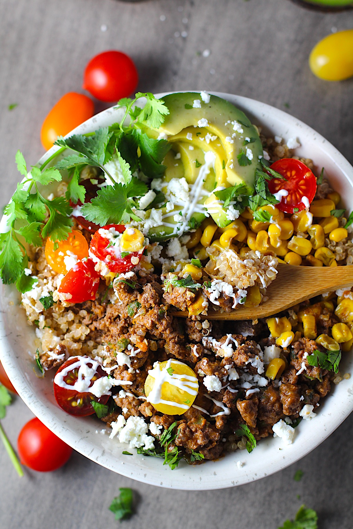 - Fill bowls with the various toppings: crumbled cotija cheese, tomatoes, cilantro, scallions, corn, avocado, and cilantro lime crema. Fill individual bowls with a heaping spoonful of quinoa, then the ground beef mixture. Let everyone pick their toppings. Enjoy!