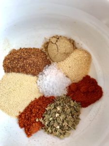 I like to double or triple this cajun spice mix recipe and keep it for sprinkling into a variety of quick dinner mains or sides. It includes Chili powder, cumin, oregano, garlic powder, smoked paprika, onion powder, cayenne pepper, salt, and ground black pepper.
