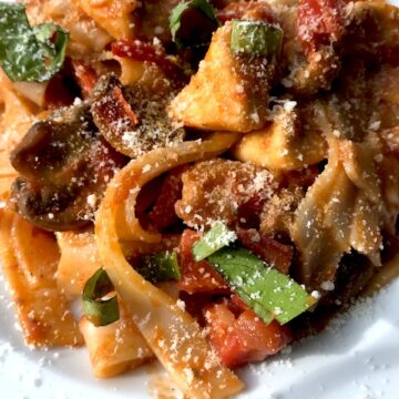 Chicken Tomato Pasta with Red Peppers & Mushrooms