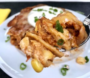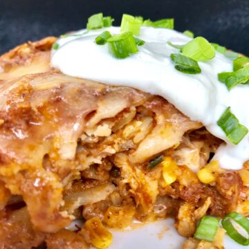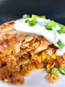 - Serve a piece of the enchilada casserole and top with sour cream and scallions. Enjoy!