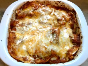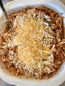 - Mix the enchilada ingredients: cooked pasta, shredded chicken, cooked chorizo, corn, 2 cups shredded cheese, 3 scallions diced (save 2 Tbls for garnish), the tortilla pieces, and half of the sauce.