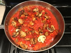 And then comes the sauce… Sauteed mushrooms, garlic, canned diced tomatoes, fresh red bell pepper, and dried oregano. Cook down to a thick mouthwatering sauce.