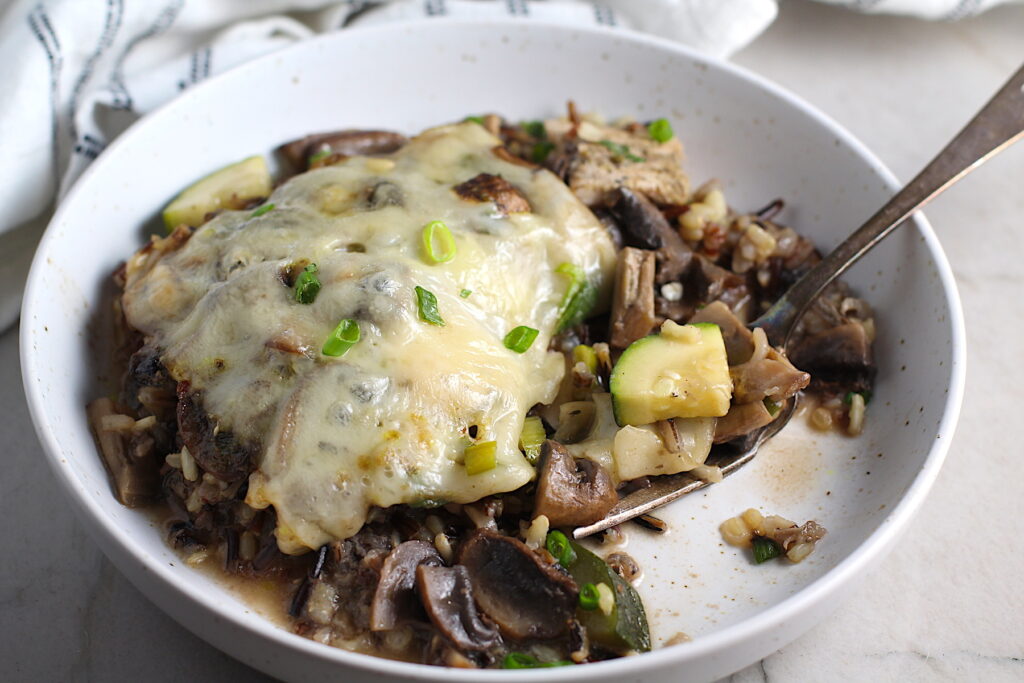 This is one warm, comforting, and hearty dinner! Chicken Wild Rice Casserole with Zucchini and Mushrooms has nutty and chewy wild rice, chunks of chicken, tender zucchini, earthy mushrooms topped with swiss cheese. Everything cooks in this one casserole dish for super easy clean up too! It’s a great dinner to make ahead and simply reheat on long Summer days, busy Fall weeknights, or cold Winter evenings.