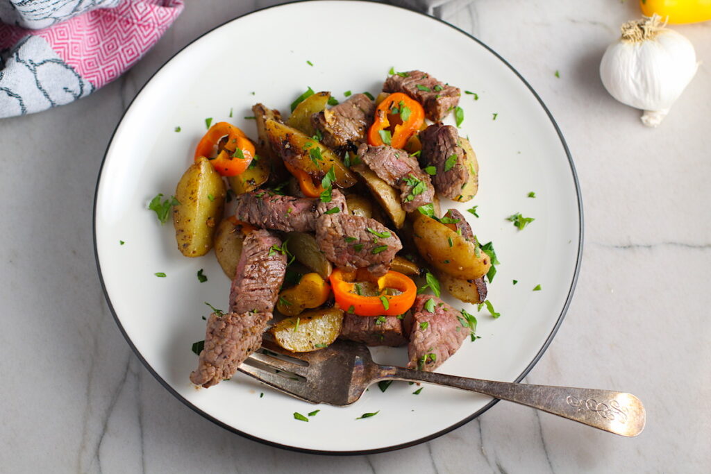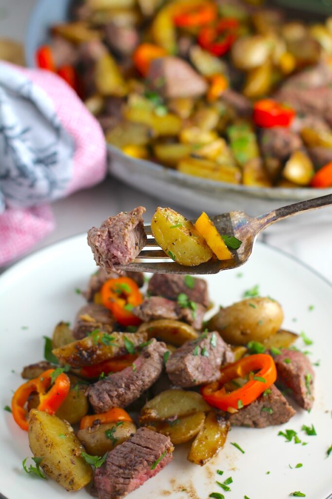 Yep! You can use just about any potato that you want, as long as you cut it into small bite-size pieces. The best potatoes are going to be small creamer or yukon potatoes as the skins are thin and tender so you don’t have to worry about peeling them. If you use russet potatoes or sweet potatoes, you will want to peel them first. Sweet potatoes may also take a bit longer to cook, so test them with a fork to make sure they are cooked through before moving on to the steak.