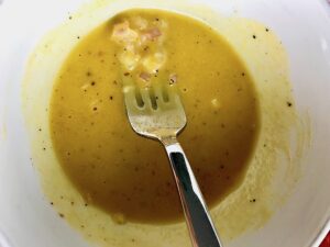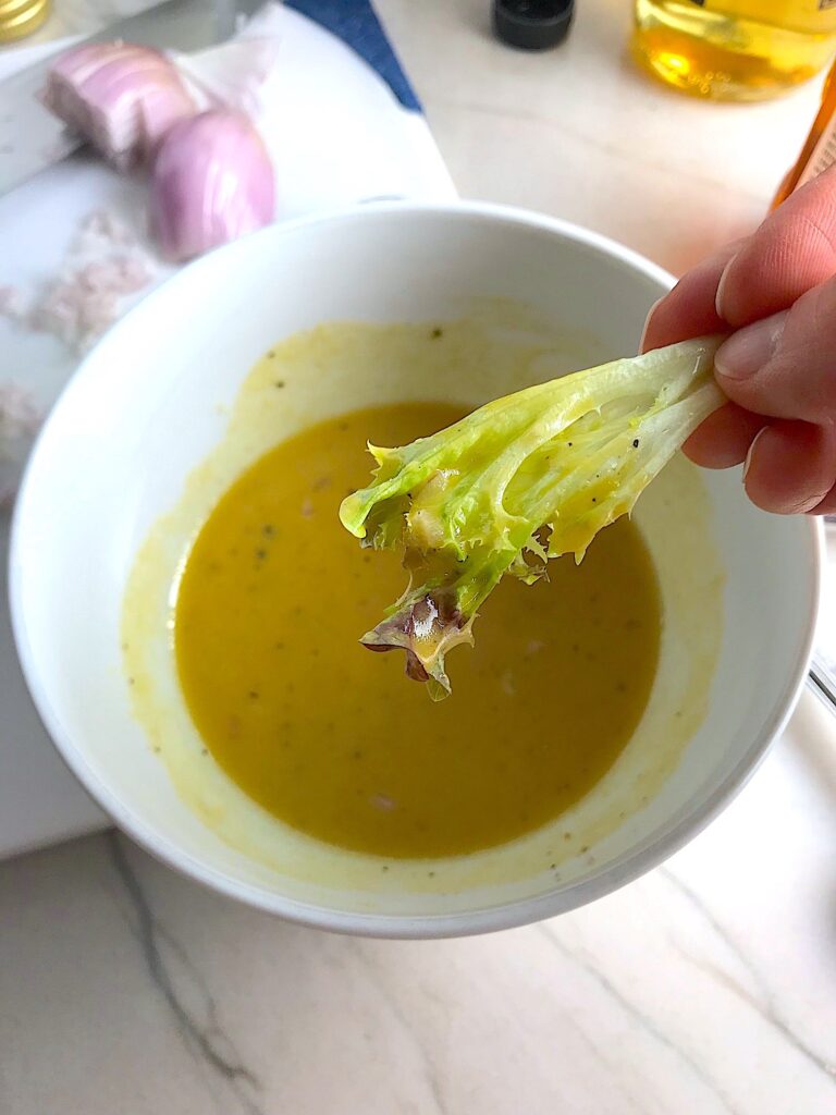 Shallots have a milder flavor than onions do, so if you only have a regular yellow or red onion or similar, here’s what to do. First, finely chop and use HALF of what the recipe calls for. I mean, really finely chop so that you do not get a large chunk of onion in any bites. Then soak the chopped onion in some cold water for an hour before adding it to the dressing. Of course, if you are a big onion lover, you can add more.
