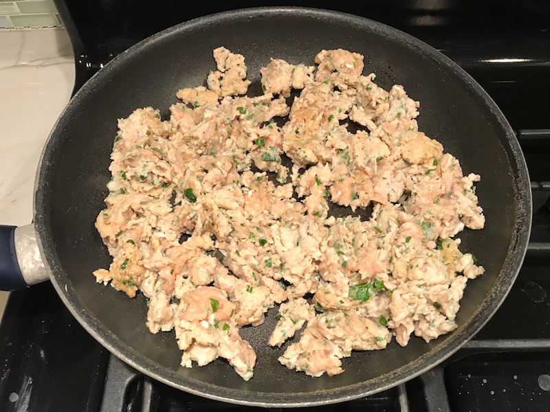 - To a preheated pan, add 1 tbls extra virgin olive oil. Add the Italian Sausage chicken mixture. Break apart the meat and let it sear. Continue to break it up into bite-size pieces and let it brown on all sides, about 8 minutes total cooking time.