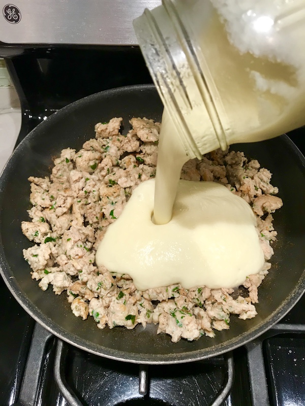 Pour in the cauliflower cream sauce and stir to combine the flavors, scraping the bottom of the pan for all of the brown-goodness and mixing the sausage into the sauce.