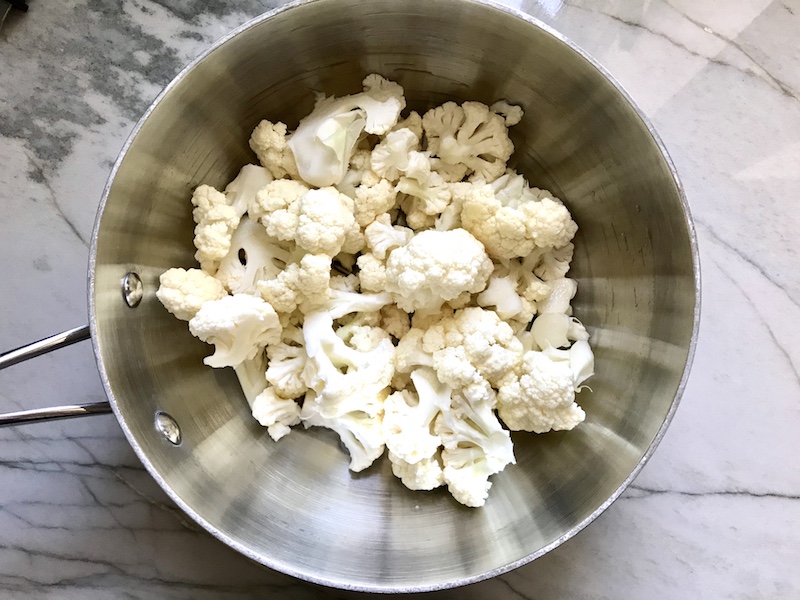 - Place the cauliflower florets in a medium sauce pot and fill with water to about ⅓ as high as the florets. Cover and turn the stove to medium heat. Water should come up to a boil and cook with cover on for 8-10 minutes.