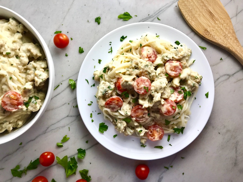 - It has cauliflower cream. A couple weeks back I posted Green Cauliflower Cream Fettuccine, which was vegetarian, but meat lovers can enjoy this creamy dairy-free delight too!