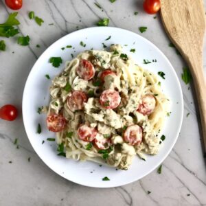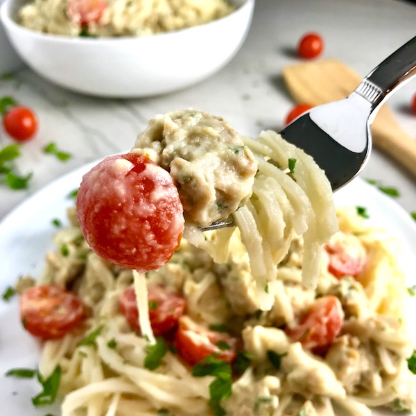 This Cauliflower Cream Pasta or Cauliflower Bechamel Sauce recipe has homemade garlic and herb filled Ground Italian chicken sausage with bright and fresh cherry tomatoes in a rich and creamy non-dairy cauliflower cream sauce – YUM! You could just eat it with a spoon…maybe right out of the pan…I’m just sayin’. However, to make it more civilized, the recipe suggests to mix it with light and airy, thin rice noodles that soak up every last bit of the sauce for the perfect bite!