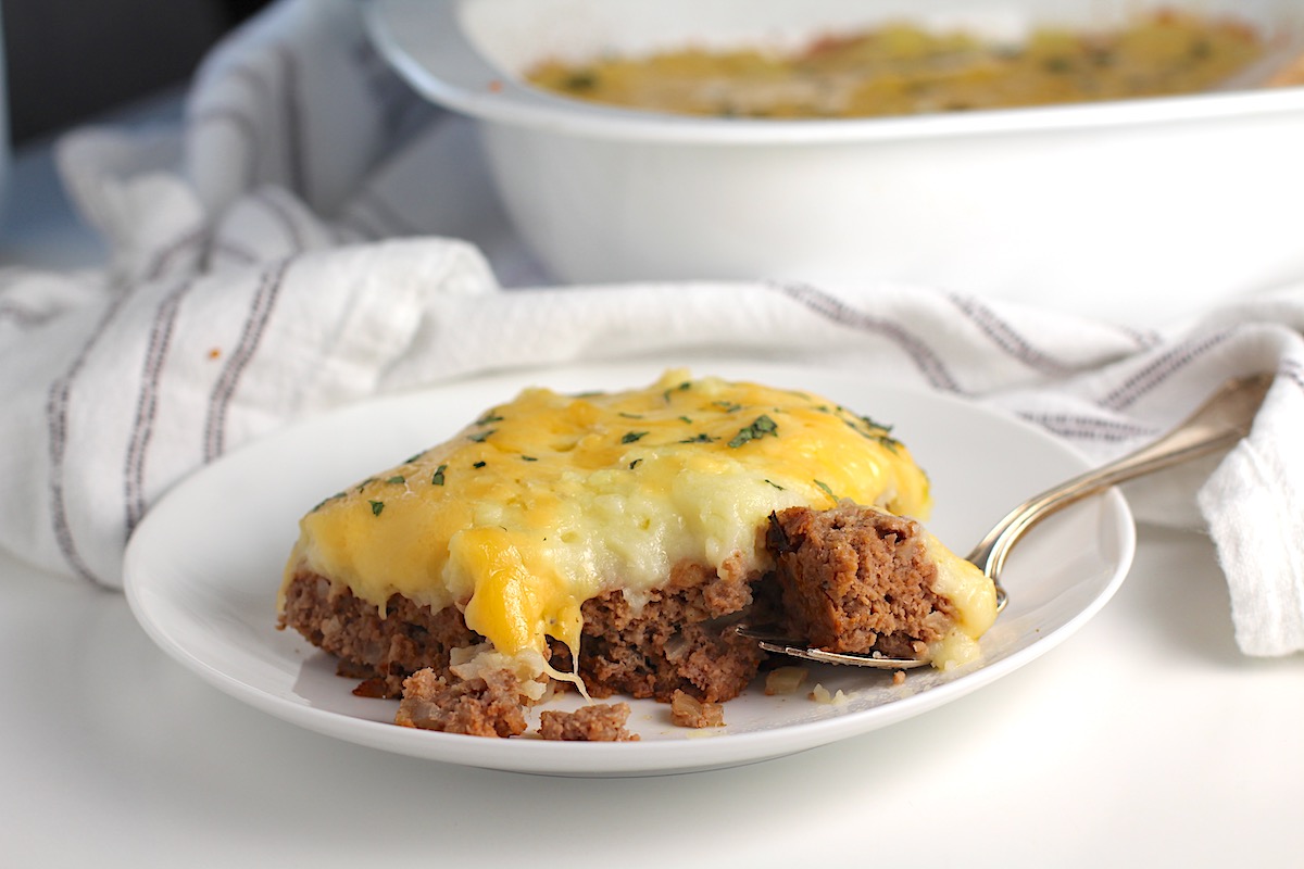 You get the flavorful juicy meatloaf on the bottom, topped with creamy fluffy mashed potatoes, then salty melted cheese on top. It’s total comfort food. All you need to add is a side vegetable and you have a complete meal.