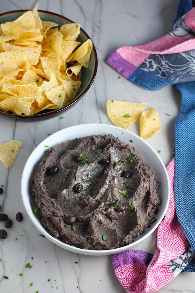 Refried beans are quite literally beans that are fried/cooked two times. They are first cooked and then mashed and cooked again. They are usually made with pinto beans, which have a milder flavor and contain a slightly more carbs and a higher fat content than black beans, attributed mainly to their high starch content. In this recipe, I love to use black beans! I always have them on hand to make Slow Cooker Brazilian Black Bean, as well as so many other yummy dinners.