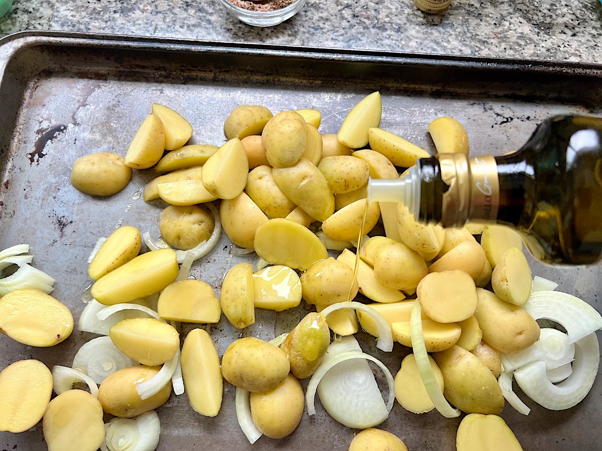 Combine potatoes and onions on a sheet pan, then drizzle with oil.