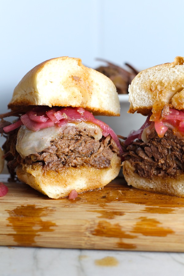 Now, comes the fun part…eating! Here are some yummy options. First, brisket sandwiches recipe. I love to eat this deliciousness on a roll that soaks up all the beef juices. I place the beef on the bottom of the roll and top with a melty cheese like monterey jack or mozzarella. Then put it under the broiler to melt! Finally, I top it with pickled onions to add sweetness, tang, and crunch!