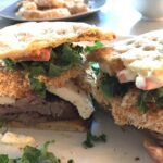 This sandwich has so many flavors and textures piled on between 2 crispy pieces of flatbread. The tender flank steak is topped with crisp kale, creamy and salty Feta, tangy and sweet roasted red pepper, Crispy savory onion rings, & another salty layer of garlic aioli...YUMMY!