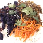 Place shredded cabbage on a sheet pan, drizzle with 1 tsp. sesame oil, salt, pepper, then toss to coat and push to 1 half of the pan. In the other half of the pan, place the shredded carrots with 1 tbls soy sauce and 1 teaspoon olive oil, then toss to combine. Roast for 20 minutes.
